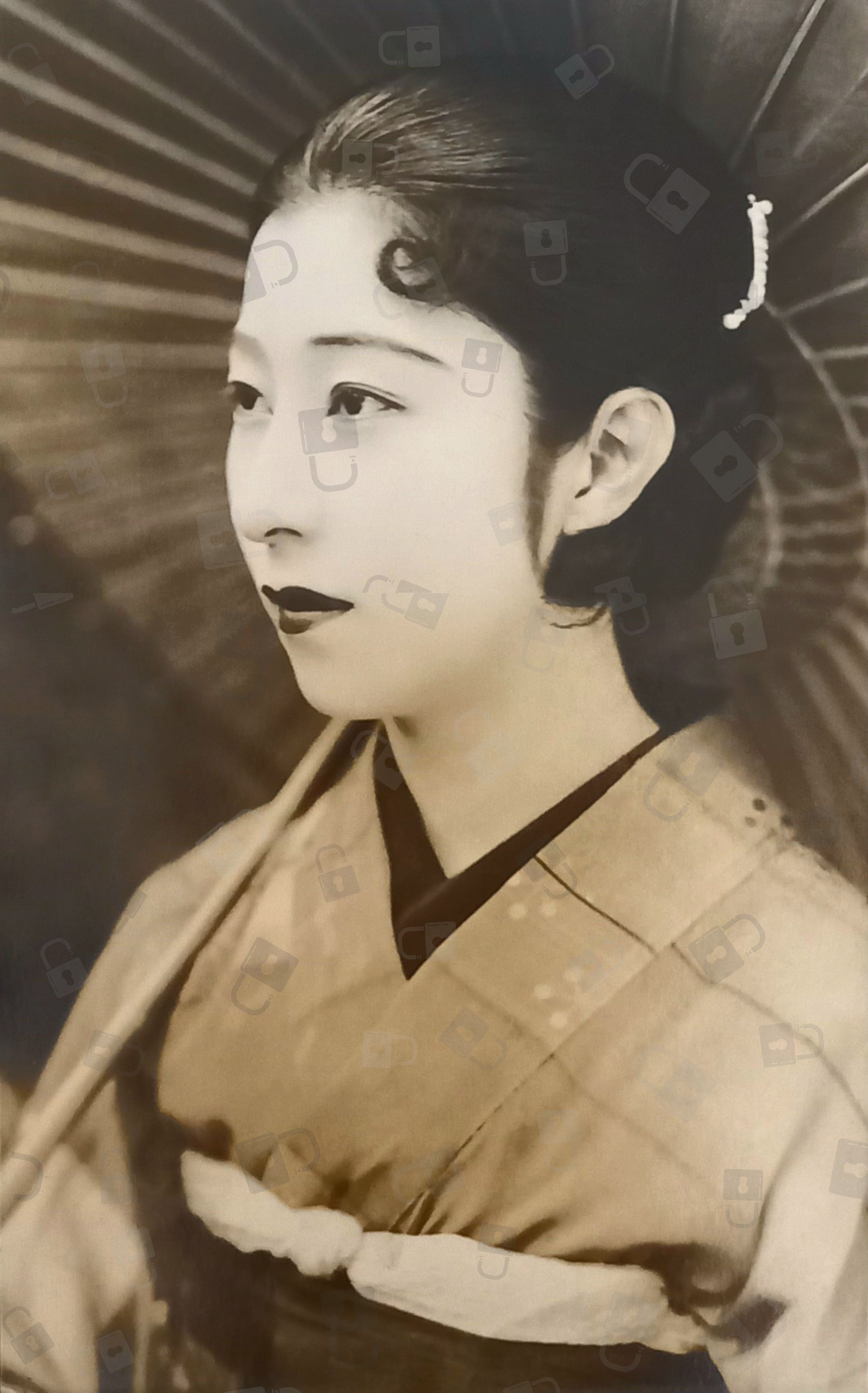 和傘をさしたレトロ感あふれる八雲恵美子のブロマイドを修復して現代によみがえらせました。