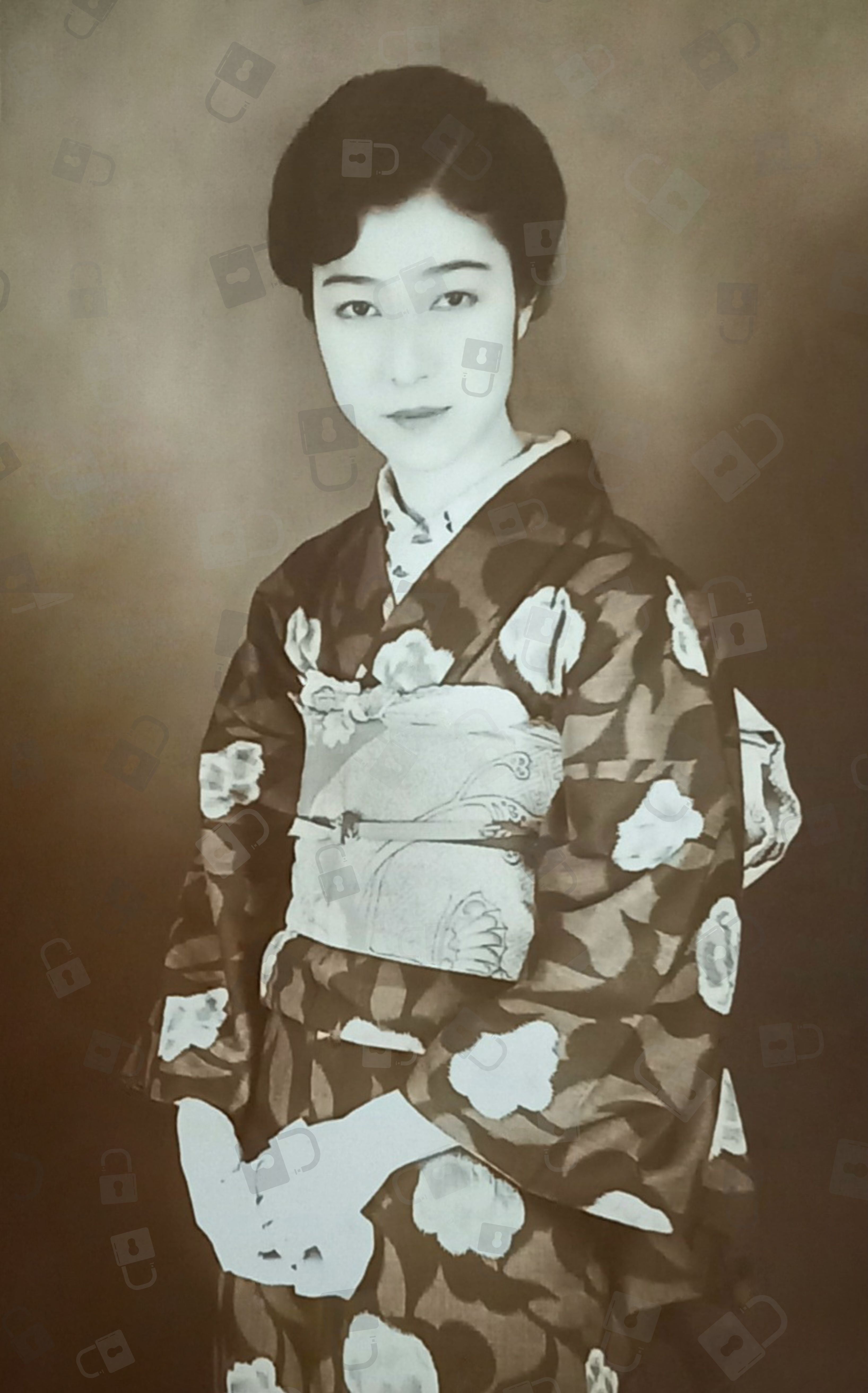 モダンな薔薇柄のデザインの着物をまとった八雲恵美子のブロマイドを修復して現代によみがえらせました。