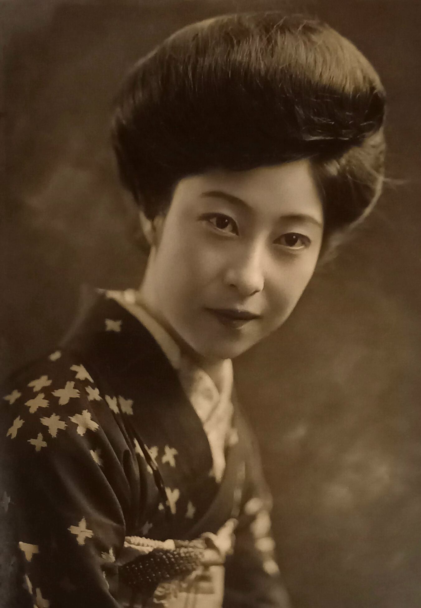 大正末~昭和初期に流行った束髪でキリッとした憧れのお姉さま的雰囲気の八雲恵美子のブロマイドを修復して現代によみがえらせました。