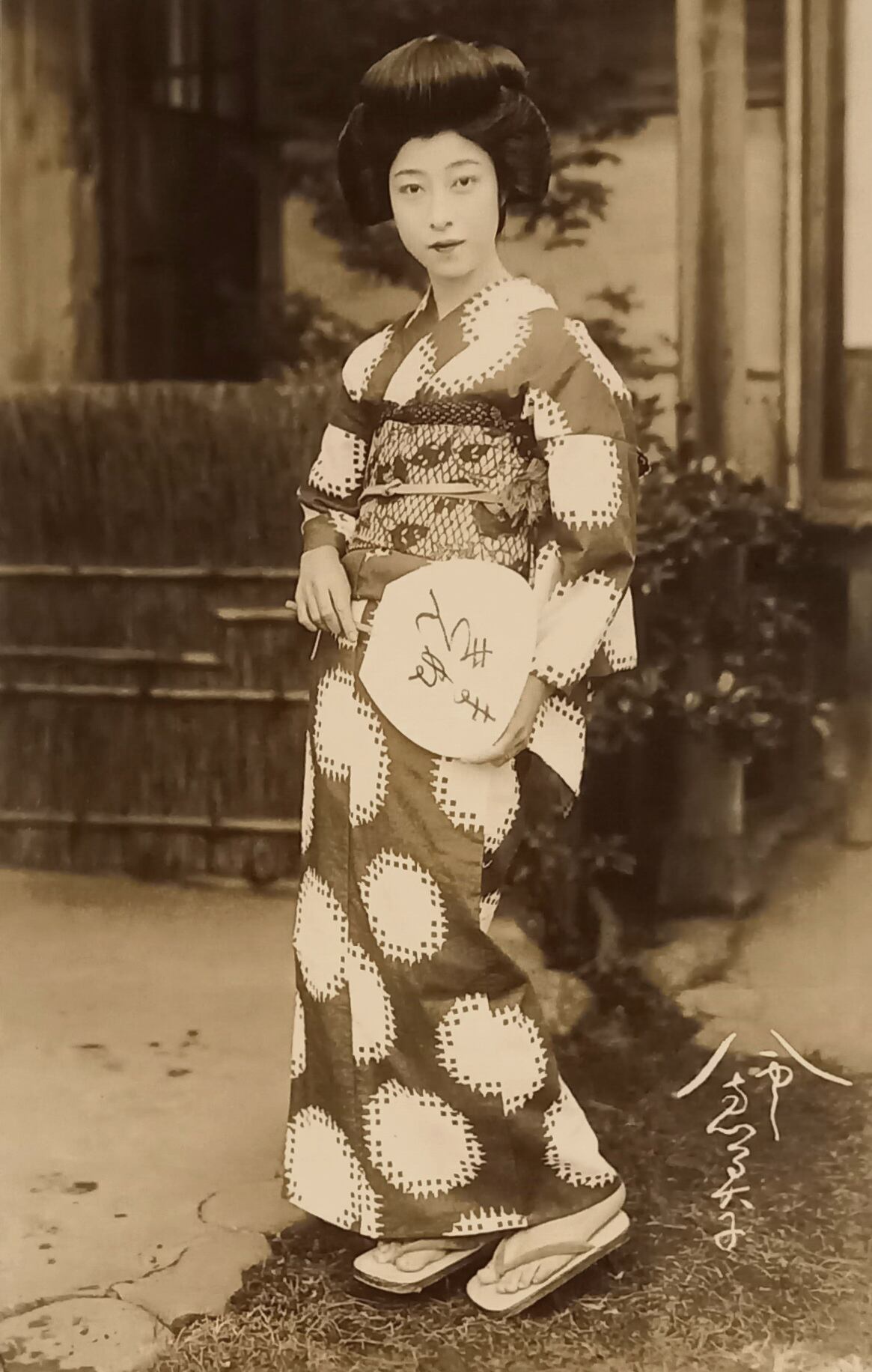 キリッとして憧れのお姉さま的雰囲気の日本髪で浴衣姿の八雲恵美子のブロマイドを修復して現代によみがえらせました。