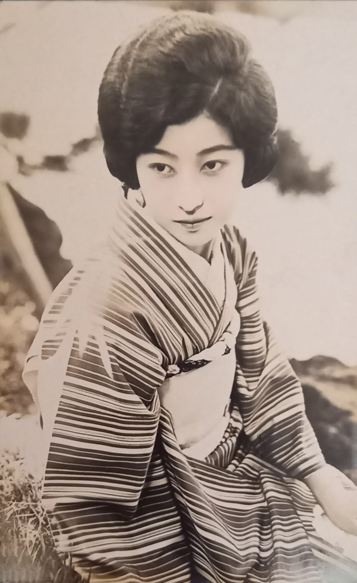 キリッとして憧れのお姉さま的雰囲気の束髪で浴衣姿の八雲恵美子のブロマイドを修復して現代によみがえらせました。